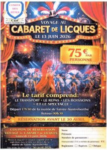 SORTIE CABARET Le comité des fêtes de Sainte-Austreberthe vous propose une sortie exceptionnelle au cabaret de Licques ! 🎟 Tarif : 75 € 👉 Comprend