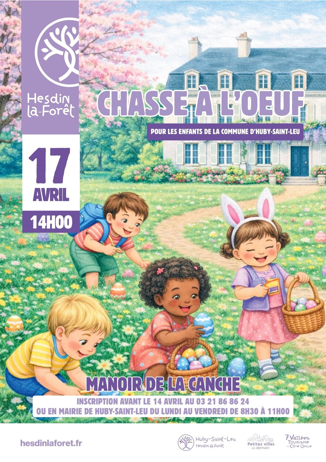 Chasse aux œufs ce vendredi 17 avril organisée par le Comité des Fêtes de Huby-Saint-Leu. Les inscriptions se font à la mairie d’Huby ou au 03 21 86 86 24